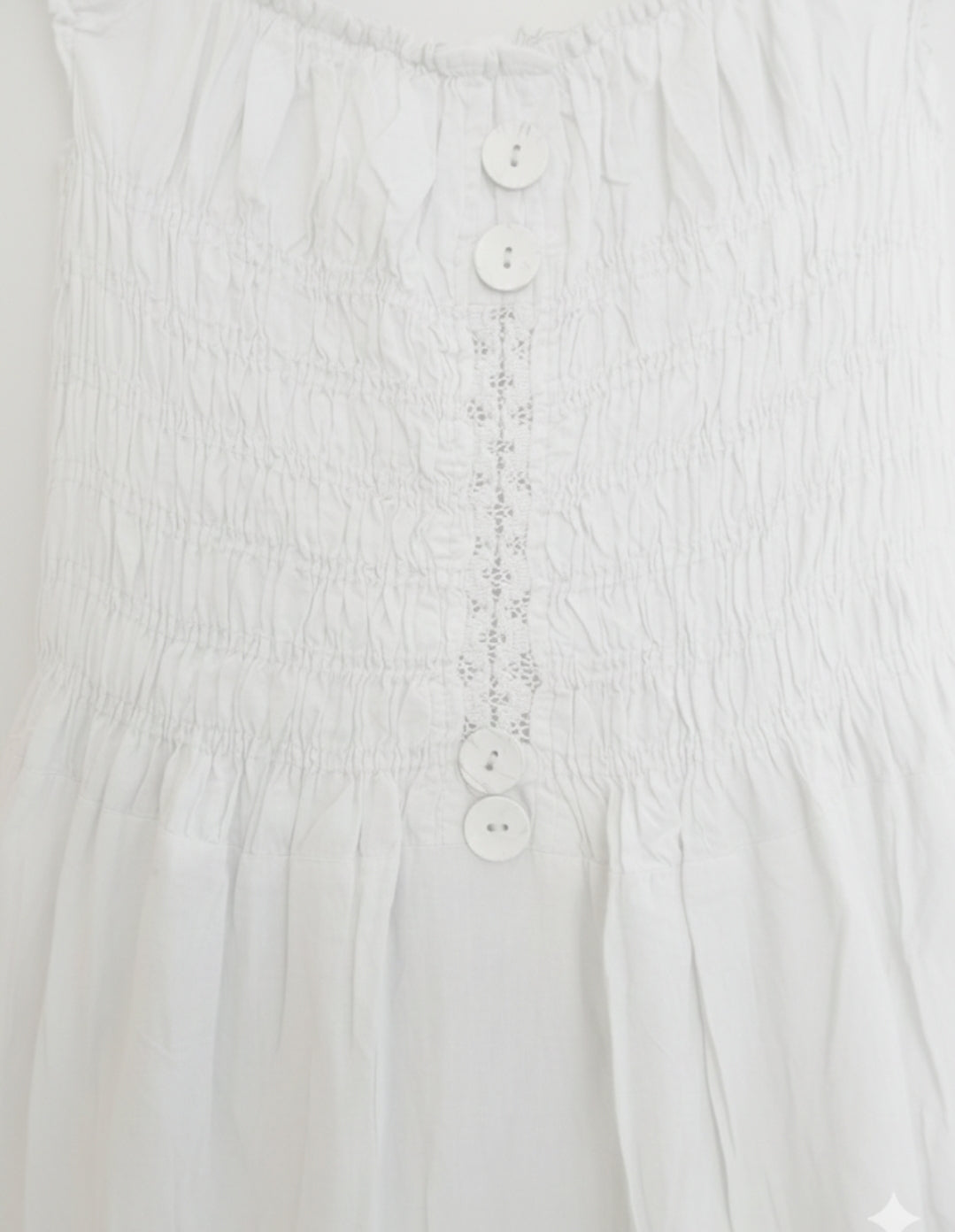 The dress features a fully shirred (smocked) bodice that offers plenty of stretch and a form-fitting shape. It is accented with a vertical row of decorative, buttons running down the center chest.