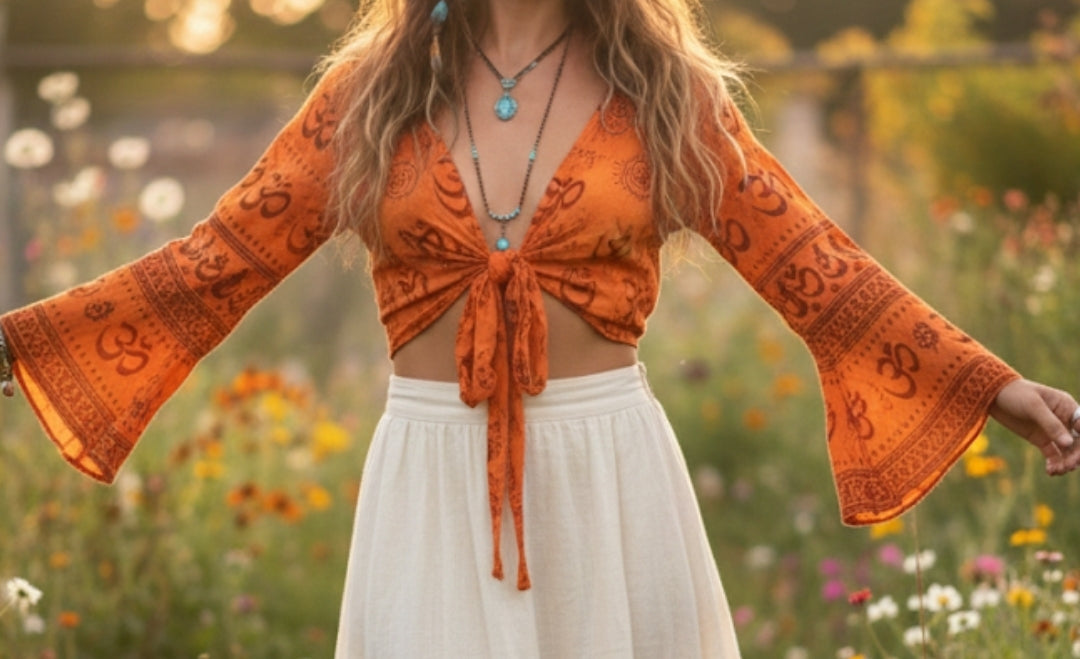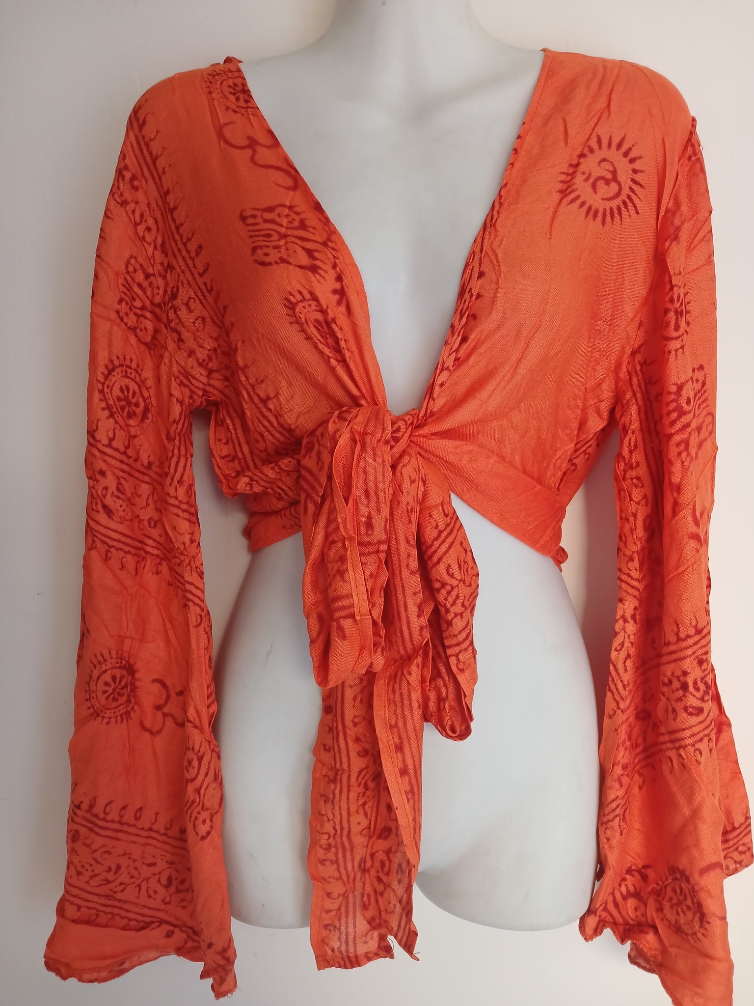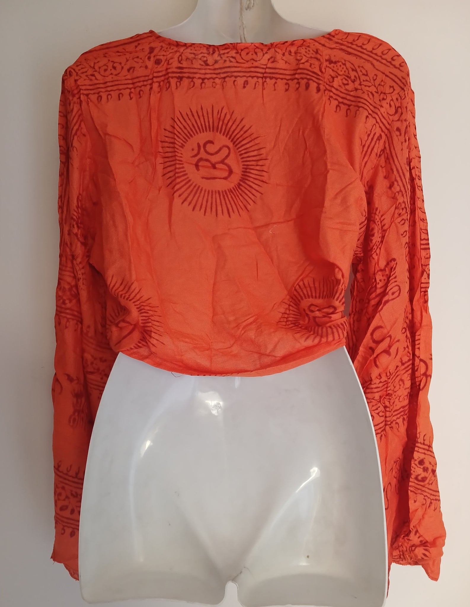 Breathable, bold, and beautiful. This long-sleeved rayon top features a stunning orange hue and sacred Om symbols, bringing a touch of mindfulness to your everyday outfit.